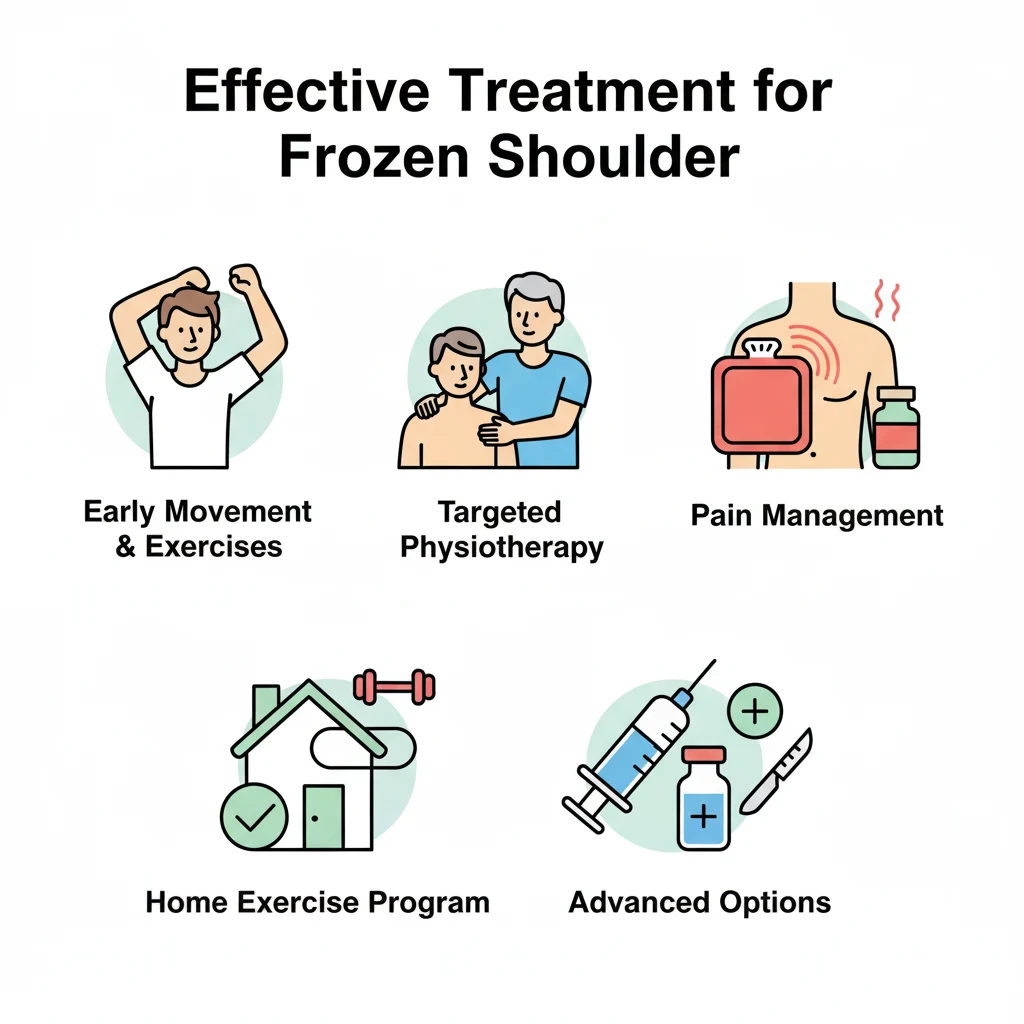 - Advanced options – For persistent cases, options include hydrodilatation (capsular distension), manipulation under anesthesia, or arthroscopic capsular release. These are considered when conservative care fails.