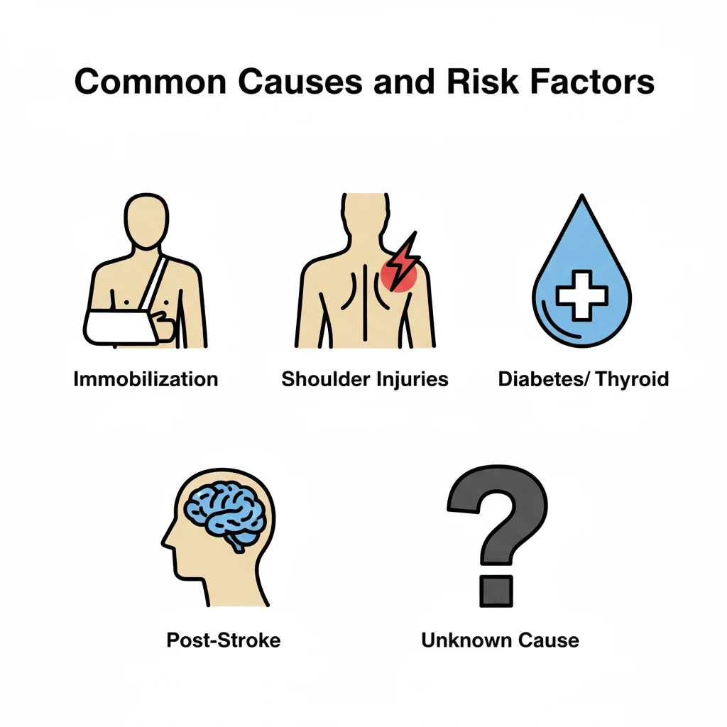 - Post-stroke and neurological conditions – Reduced mobility after stroke raises the chance of frozen shoulder development.